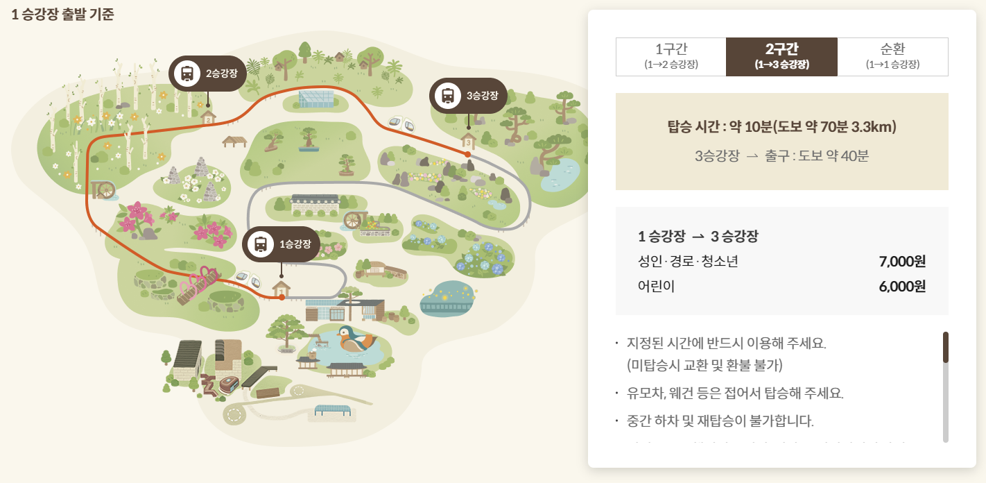 화담숲 내 모노레일은 총 3가지 구간으로 나뉩니다. 1구간은 약 5분 소요되며 도보로는 40분이 걸리고, 2구간은 약 10분 소요로 도보로는 70분 정도가 소요됩니다. 순환 코스는 약 20분 동안 탑승할 수 있어 화담숲 전체를 편안하게 둘러볼 수 있습니다.